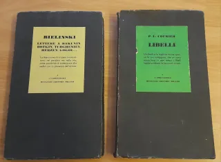 Due volumi rari della celebre collana "I coriandoli" pubblicati da Muggiani Editore Milano nel 1945. Prime edizioni del dopoguerra, caratterizzate dalla tipica copertina nera con etichetta colorata applicata. Vissarion Belinski - Lettere a Bakunin, Botkin, Turgheniev, Herzen, Googol...tradotte dal russo da Alessandra Ilijna. Prima edizione settembre 1945, collana Coriandoli n.4 P. L. Courier - Libelli a cura di Bruno Revel, Prima edizione novembre 1945, collana Coriandoli n.8. I volumi sono in buone condizioni, copertine con normali segni del tempo (quella Libelli e un po' strappata), pagine naturalmente brunite dal tempo.