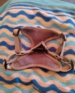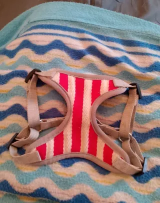 Pettorina a righe per cani di piccola taglia. Il design a righe rosse e bianche la rende un accessorio alla moda. - Tessuto resistente e confortevole. - Spalline regolabili per una vestibilità ottimale. - Taglia S.