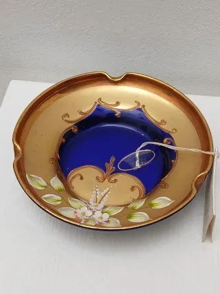 Elegante posacenere vintage in vetro di Murano, con finiture in oro e dettagli floreali dipinti a mano. - Colore principale: blu intenso. - Decorazioni: motivo floreale con fiori bianchi e rosa, foglie verdi e riccioli dorati. - Materiale: vetro di Murano.