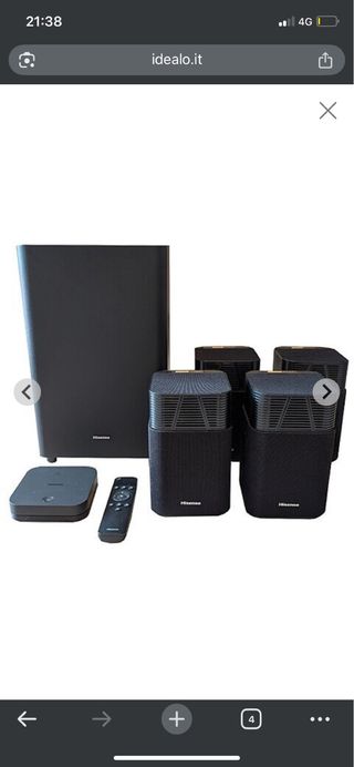 Sistema Home Theatre Hisense HT Saturn. - Subwoofer nero. - Quattro altoparlanti satellitari neri. - Unità centrale nera. - Telecomando nero.