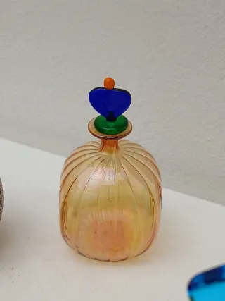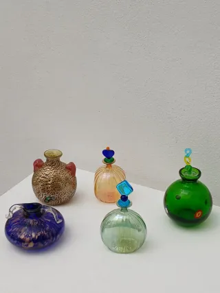 Set di 5 boccette decorative in vetro di Murano. - Pezzi unici con lavorazione artigianale. - Ideali come soprammobili o per profumi. - Ogni boccetta presenta dettagli colorati e forme uniche.