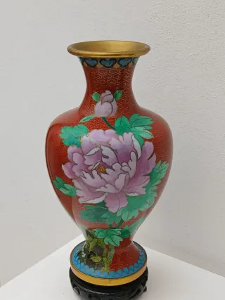 Splendido vaso cinese vintage in stile cloisonné, con una decorazione floreale vivace e dettagliata. Un pezzo unico che aggiunge un tocco di eleganza a qualsiasi ambiente. - Motivo floreale intricato. - Base in legno intagliato inclusa.