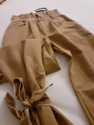 Pantaloni da donna Rebellius, nuovi. Misure in foto - Vita alta con dettaglio arricciato. - Gamba ampia. - Fondo gamba con laccetti per chiusura. - Tasche laterali.