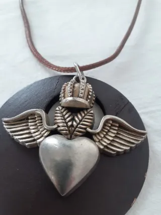 Collana con un ciondolo a forma di cuore alato, simbolo di amore e libertà. Il pendente è montato su un girocollo in cordino marrone. - Ciondolo in metallo argentato. - Base del ciondolo in materiale scuro, probabilmente legno o similpelle. - Cordino regolabile.