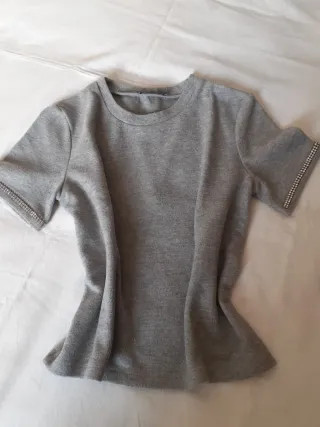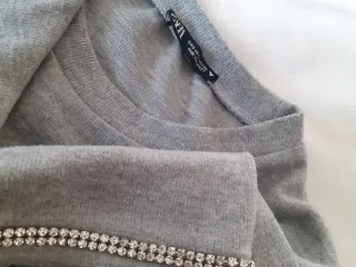 Maglioncino grigio Zara con dettagli luminosi sulle maniche. - Maniche corte. - Girocollo. - Orlo con strass.