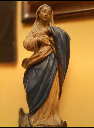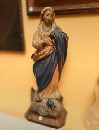 Delicata scultura della Madonna realizzata in terracotta. - Dettagli dipinti a mano.