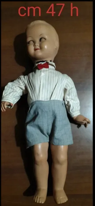Bambola vintage in plastica, alta circa 47 cm. - Indossa una camicia a righe con papillon rosso. - Pantaloncini grigi. - Espressione facciale unica.