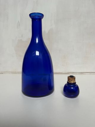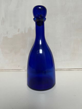 Elegante bottiglia in vetro di un intenso colore blu, completa di tappo. - Design slanciato e raffinato. - Tappo decorativo per chiudere la bottiglia. Altezza 23 cm