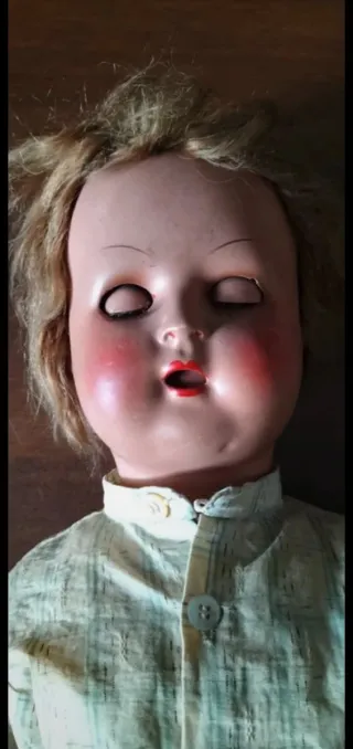 Bellissima bambola antica, un pezzo da collezione. - Capelli biondi. - Guance rosse. - Labbra rosse. - Indossa una camicia a quadri.