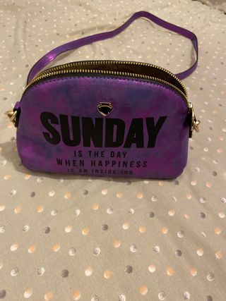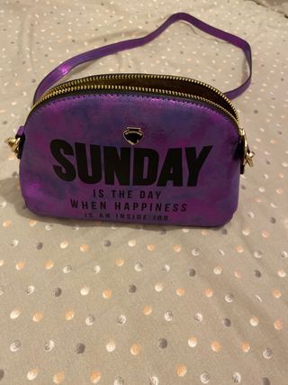 Piccola borsetta Le Pandorine con una frase. - Colore viola metallizzato con dettagli oro. - Scritta SUNDAY IS THE DAY WHEN HAPPINESS IS AN INSIDE JOB.