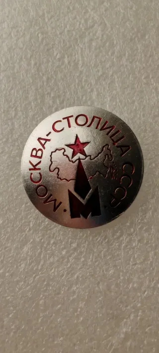 Spilla commemorativa dell'Unione Sovietica. - Raffigura una mappa stilizzata dell'URSS. - Presenta la scritta MOSCA - CAPITALE e CCCP. - Dettagli in smalto rosso e metallo argentato.