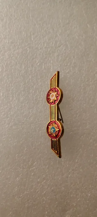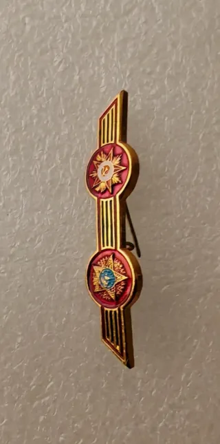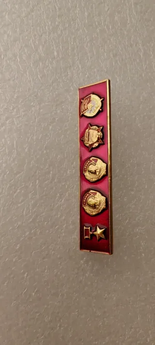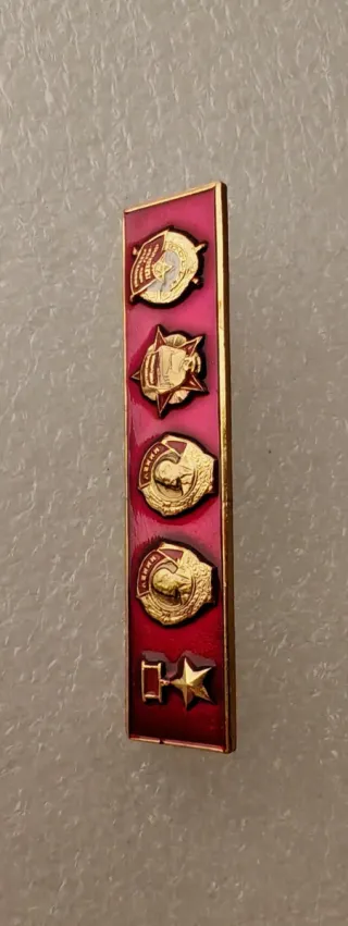 Spilla commemorativa dell'Unione Sovietica. - Design rettangolare con finitura rossa e dettagli dorati. - Presenta diverse insegne e medaglie sovrapposte. - Ideale per collezionisti di memorabilia sovietiche.