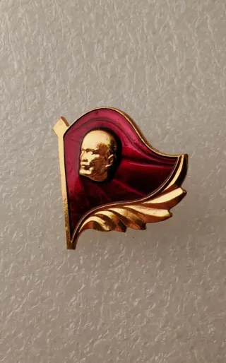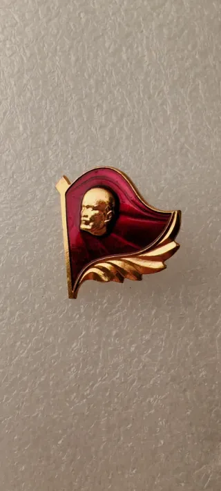 Spilla commemorativa dell'URSS con l'effigie di Lenin su una bandiera. - Design a forma di bandiera. - Ritratto di Lenin in rilievo. - Dettagli dorati e smalto rosso.