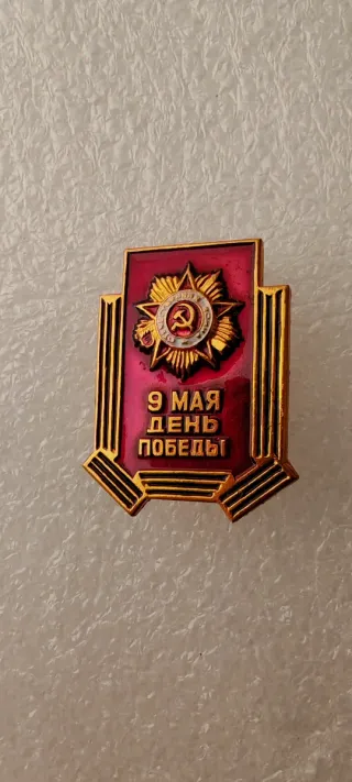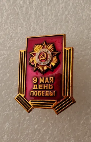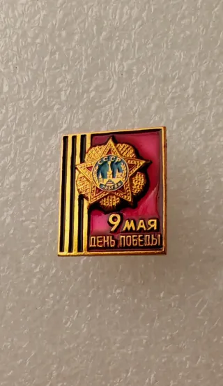 Spilla commemorativa sovietica. - Raffigura la stella sovietica con falce e martello. - Riporta la scritta 9 Maggio Giorno della Vittoria in russo.