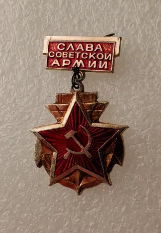 Spilla commemorativa dell'URSS con la scritta Gloria all'Armata Sovietica. - Distintivo a forma di stella rossa. - Martello e falce al centro. - Montatura dorata.