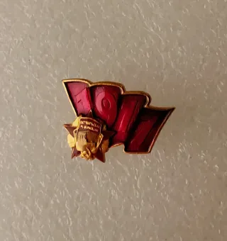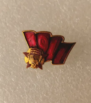 Spilla commemorativa dell'URSS con l'anno 1917. - Design a bandiera rossa. - Dettagli dorati e smaltati. - Stella a cinque punte con edificio stilizzato.
