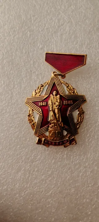 Spilla commemorativa sovietica, forse riproduzione, non vedo il marchio - Raffigura una stella rossa con le date 1941-1945. - Al centro, una figura di soldato con bambino. - In basso, la scritta 40 ЛЕТ ПОБЕДЫ (40 anni di vittoria).