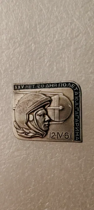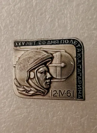 Spilla commemorativa dedicata a Yuri Gagarin e al suo primo volo spaziale. - Raffigura il profilo di un astronauta con casco. - Presenta la scritta XXV LET SO DNYA POLETA YU.A. GAGARINA. - Indica la data 12-IV-61.