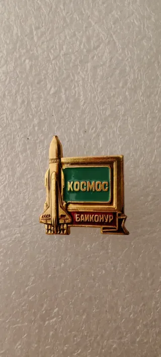 Spilla commemorativa del cosmodromo di Baikonur. - Design con razzo e navicella spaziale. - Scritta КОСМОС (Spazio) in verde. - Scritta БАЙКОНУР (Baikonur) in rosso. - Sigla СССР (URSS) sul razzo.
