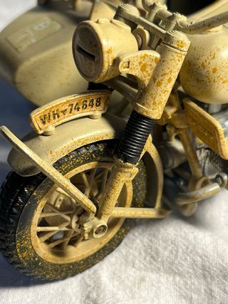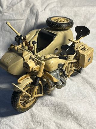 Modellino di moto BMW R75 della Seconda Guerra Mondiale con sidecar. - Replica dettagliata. - Colore sabbia. - Include mitragliatrice e ruota di scorta.