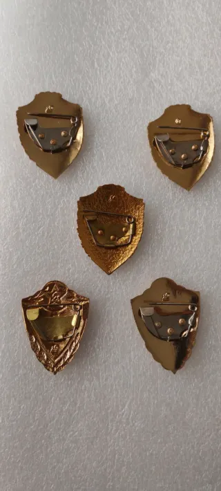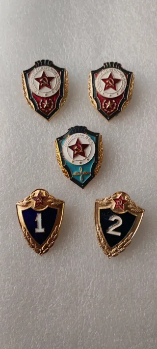 Set di spille commemorative dell'Unione Sovietica. - Spilla con stella rossa e falce e martello. - Spilla Olimpionico VVS. - Spilla 1 con stella rossa. - Spilla 2 con stella rossa.
