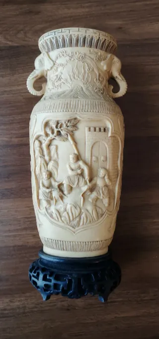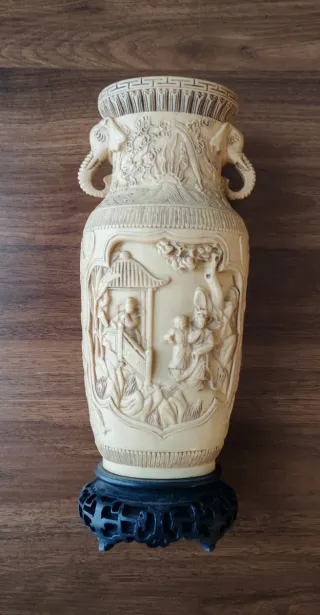 Elegante vaso con decorazioni in rilievo in stile orientale. Presenta dettagli finemente lavorati che richiamano scene tradizionali. - Motivi floreali e figure umane. - Manici a forma di elefante. - Base decorativa inclusa.