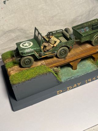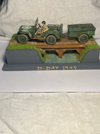 Diorama dettagliato ambientato durante la Seconda Guerra Mondiale, raffigurante un Jeep con rimorchio. - Modello Jeep Willys. - Rimorchio militare. - Ambientazione ponte e terreno. - Scritta D-DAY 1944 sulla base.