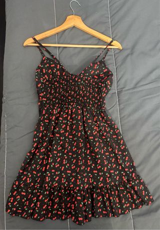 Bellissimo abito corto di CVG Gold con stampa a ciliegie su fondo nero. Capo super fresco e femminile, perfetto per l'estate! - MAI indossato! - Presenta un grazioso fiocco sul décolleté e spalline sottili. Plus: Ha le coppe integrate, quindi è comodissimo da indossare anche senza reggiseno.