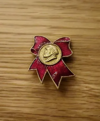 Spilla a forma di fiocco con medaglione raffigurante Lenin. - Dettagli in oro. - Fiocco rosso smaltato.