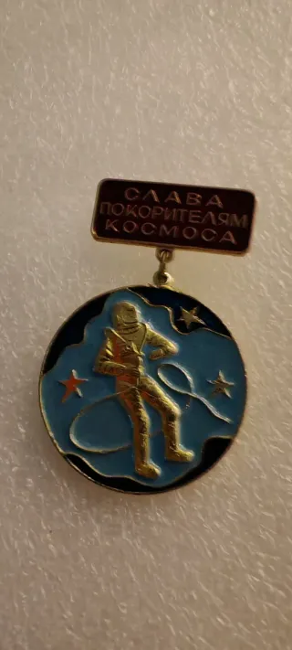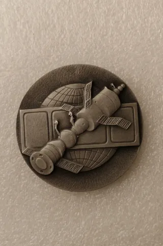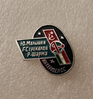 Spilla commemorativa del programma spaziale Interkosmos. - Raffigura i cosmonauti Yu. Malyshev, G. Strekalov e R. Sharma. - Simboli dell'URSS e dell'India. - Design smaltato con dettagli argentati.