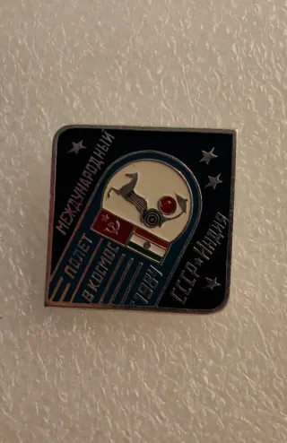 Spilla commemorativa del volo spaziale congiunto URSS-India del 1984. - Design a tema spaziale. - Raffigura un cavallo stilizzato e le bandiere di URSS e India. - Anno 1984 inciso.