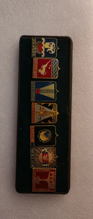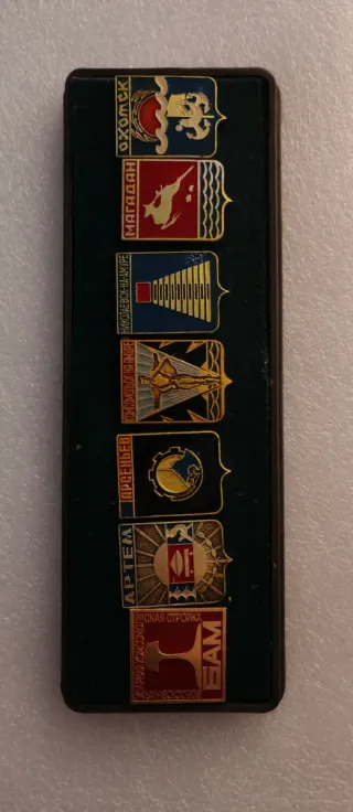 Set di spille commemorative raffiguranti città russe. - Spilla di Okhotsk - Spilla di Magadan - Spilla di Nikolaevsk-on-Amur - Spilla di Artyom - Spilla di Arsenyev - Spilla BAM