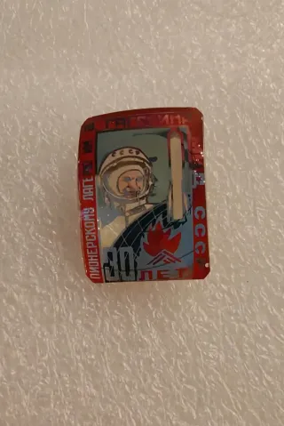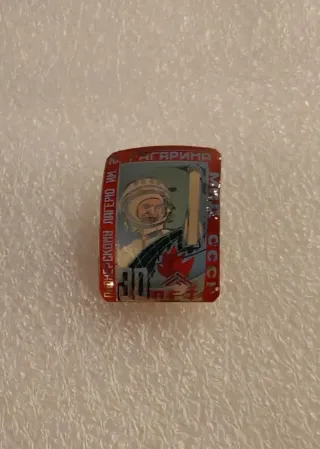 Spilla commemorativa dedicata a Yuri Gagarin, il primo uomo nello spazio. Un pezzo unico per gli appassionati di storia spaziale e del cosmo. - Raffigura Yuri Gagarin con tuta spaziale. - Presenta un razzo e la scritta CCCP. - Dettagli in smalto colorato su base metallica.