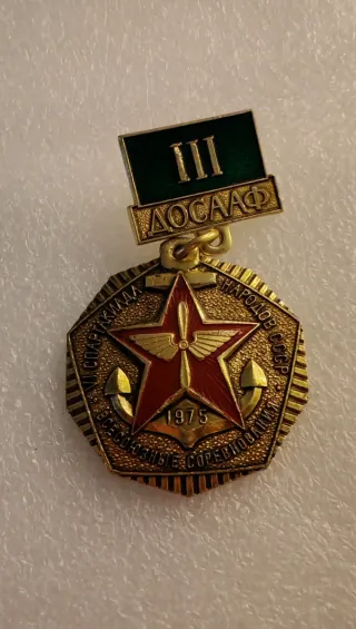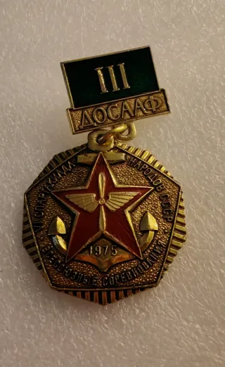 Spilla commemorativa sovietica. - Distintivo III GRADO su nastro verde. - Inscription ДОСААФ (DOSAAF). - Medaglia con stella rossa e aereo. - Anno 1975 inciso. - Scritta ВСЕСОЮЗНЫЕ СОРЕВНОВАНИЯ (Competizioni panrusse) sul bordo.