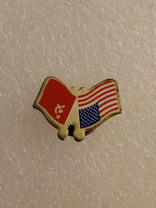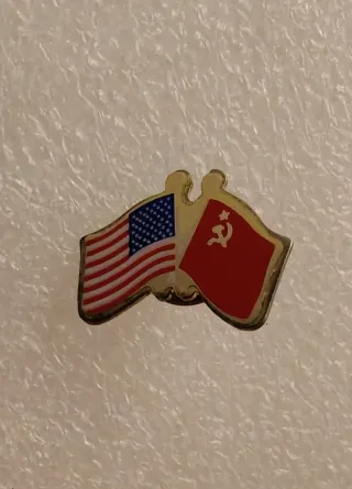 Spilla con le bandiere dell'Unione Sovietica (URSS) e degli Stati Uniti d'America (USA) sovrapposte. - Design a doppia bandiera. - Simbolo di unione o confronto tra le due nazioni.