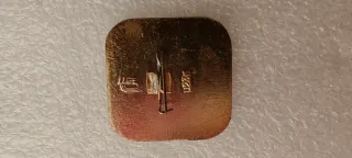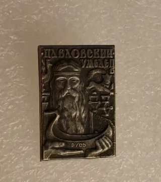 Spilla vintage con un disegno dettagliato. - Raffigura una figura maschile con barba e un elmo. - Presenta iscrizioni in cirillico. - Dettagli di una nave e simboli. - Materiale metallico.