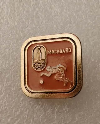 Spilla commemorativa delle Olimpiadi di Mosca 1980. - Design con logo delle Olimpiadi e atleta. - Colore oro e rosso.