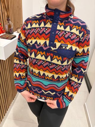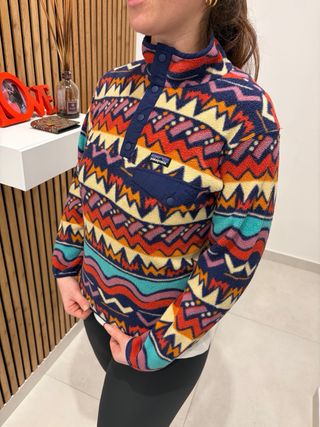 Giacca Patagonia con una vivace fantasia geometrica e ondulata. - Modello con collo alto e chiusura a bottoni. - Tasca frontale applicata. - Tessuto in pile caldo e confortevole.