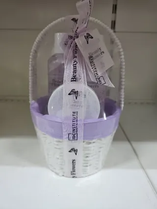 Grazioso cesto regalo IDC INSTITUTE con prodotti per la cura della persona. - Cesto in vimini bianco con finiture viola. - Nastro decorativo con farfalle e scritta Beauty Flowers. - Include un flacone e un disco in spugna.