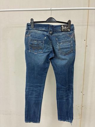 Jeans con un lavaggio particolare e dettagli decorativi. - Vita media. - Tasche anteriori e posteriori. - Decorazioni con strass e perline sulle tasche. - Effetto leggermente sbiadito e strappi. - Chiusura con zip e bottone.
