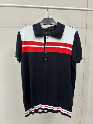 Polo a maniche corte con un design a blocchi di colore e dettagli a righe. - Colletto a costine. - Chiusura a bottoni. - Dettagli a righe rosse e bianche sul petto. - Fondo a costine con righe rosse e bianche.