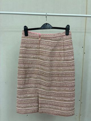 Gonna usata, in ottime condizioni, con un elegante motivo a righe. - Tessuto testurizzato. - Dettagli color oro. - Lunghezza al ginocchio. - Spacco frontale.