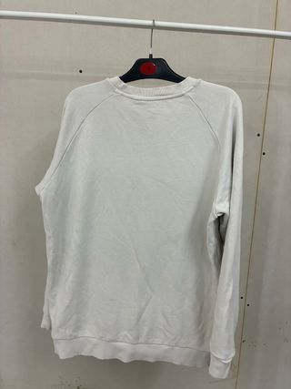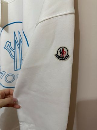 Felpa Moncler di colore bianco con un grande logo sul davanti. - Logo Moncler a contrasto blu. - Girocollo. - Maniche lunghe.