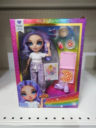 Bambola Rainbow High Violet Willow con outfit da pigiama. Include accessori per un pigiama party. - Bambola con capelli viola. - Outfit a quadri viola. - Accessori: pizza, bibita, pantofole, coperta. - Età consigliata: 6+ anni.