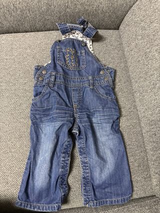 Salopette in denim per neonata, con un grazioso dettaglio floreale ricamato sulla tasca. - Tessuto denim resistente. - Bretelle regolabili. - Chiusura laterale con bottoni. - Fantasia floreale sul retro delle bretelle.