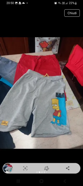 Lotto composto da quattro paia di pantaloncini per bambino. - Pantaloncini in denim blu. - Pantaloncini rossi. - Pantaloncini grigi con stampa Bart Simpson. - Pantaloncini blu con inserti azzurri.
