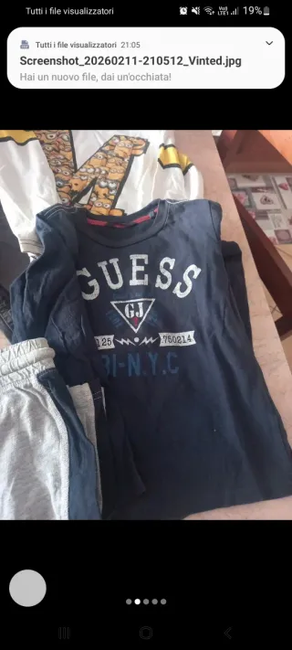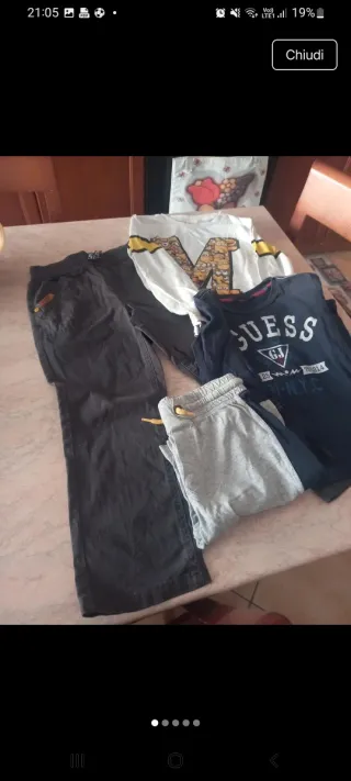 Set di abbigliamento per bambino. - Pantaloni lunghi grigi. - Pantaloni lunghi neri. - Maglietta bianca con stampa M e Minions. - Maglietta blu con stampa GUESS.