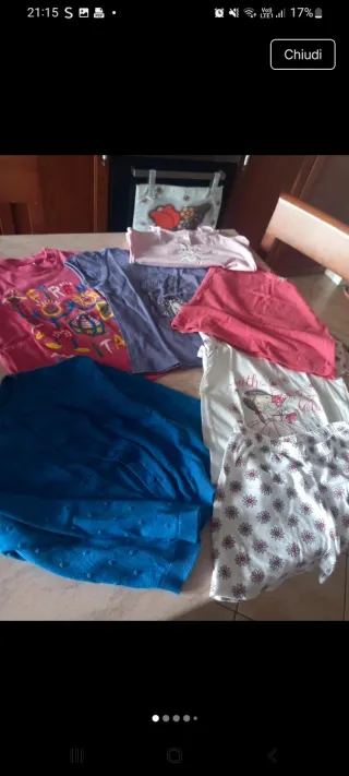 Lotto misto di capi d'abbigliamento per bambina. - Maglietta rosa con stampa - Maglietta viola con stampa - Maglietta fucsia - Maglietta bianca con stampa - Cardigan blu con pois