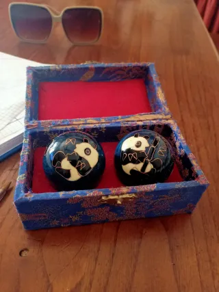 Set di due sfere cinesi di Baoding, decorate con un motivo di panda contengono internamente un piccolo carillon che roteandoli emettono un suono rilassante - Sfere con disegno di panda. - Custodia blu decorata.