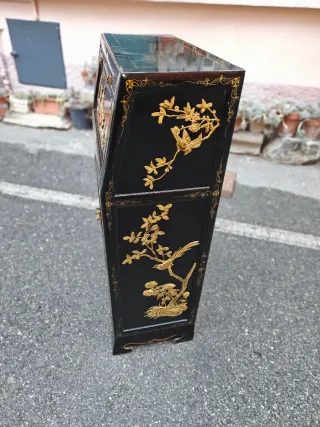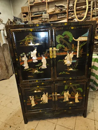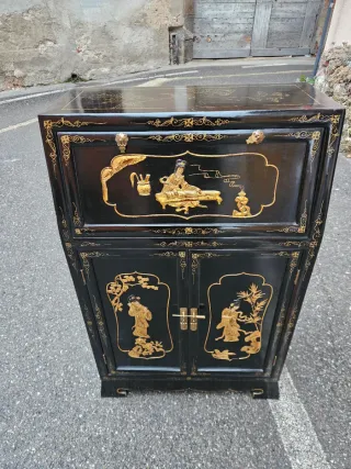 Elegante credenza in lacca cinese con decorazioni rilievi in giada e dettagli dorati. - Motivi floreali e scene figurative. - Ante con chiusura a scatto. - Gambe curve finemente intagliate. Completamente restaurato pronto da essere messo in casa EURO 599 l'oggetto si trova a Merate in via spiga n1 contattatemi sulmiotelwhatsup 329 1670765 grazie cordiali saluti